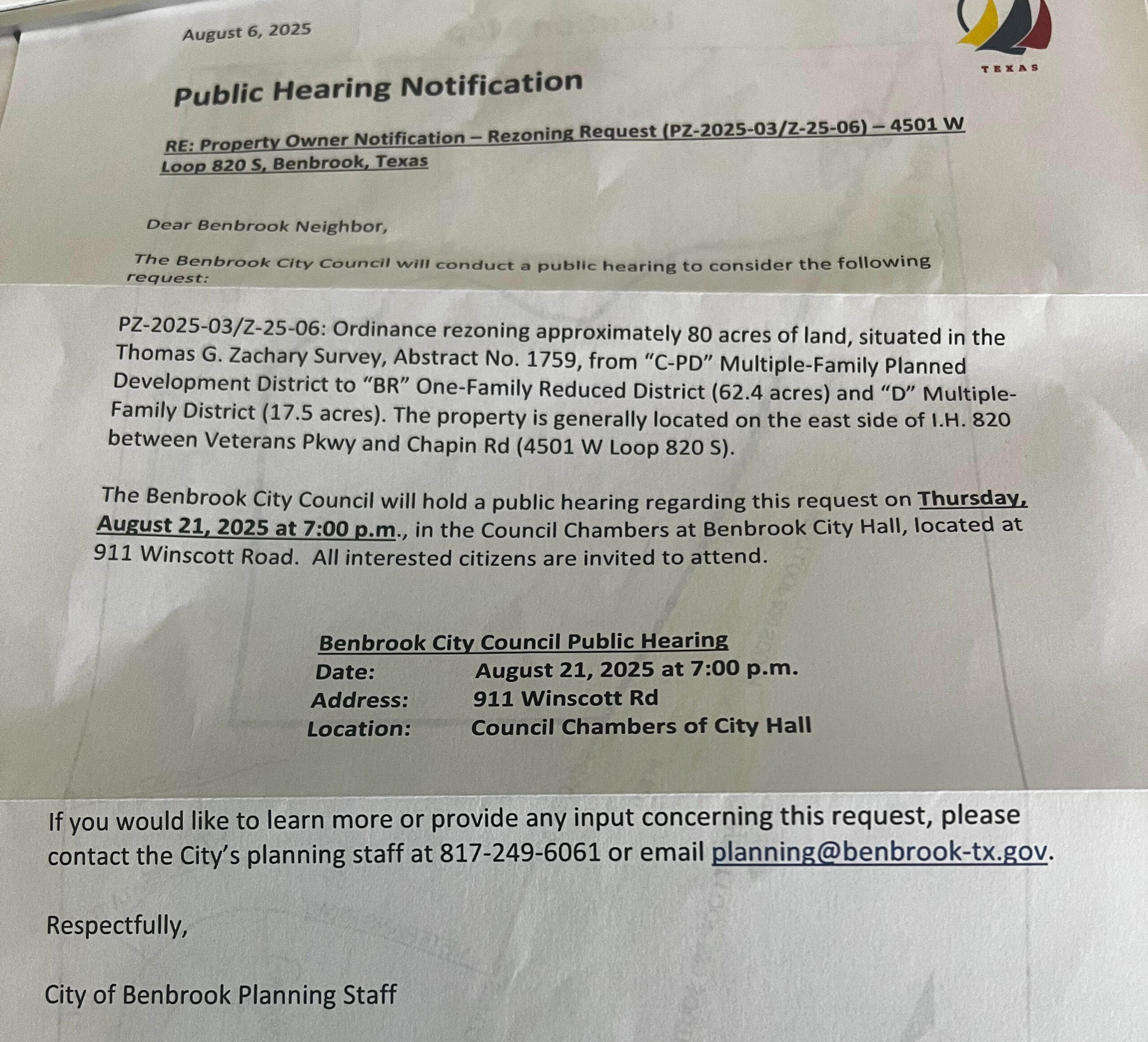 City Council Vote and Public Hearing to Rezone Thursday August 21st, 2025 @ 7pm Benbrook City Hall.